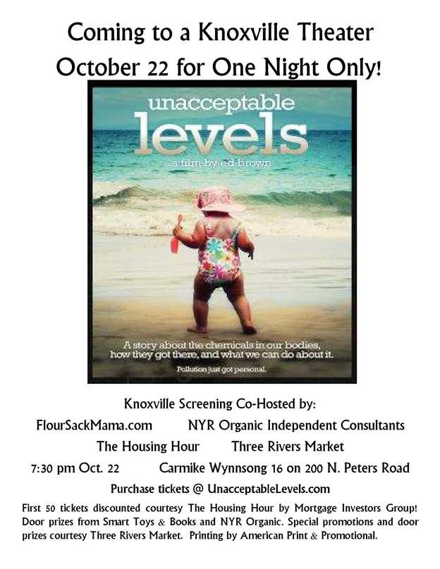 And join us Tuesday, October 22 at 7:30 pm when The Housing Hour co-hosts a special Knoxville screening of Unacceptable Levels at the Carmike Wynnsong 16 on 200 North Peters Road. Mortgage Investors Group is making possible a special deep discount price on the first 50 tickets sold. They’re available online at UnacceptableLevels.com. This film received a standing ovation at its recent premiere in Nashville and has also been shown in New York and Los Angeles. The Housing Hour is co-hosting the Knoxville screening of Unacceptable Levels along with FlourSackMama.com, Three Rivers Market and NYR Organic Independent Consultants. Smart Toys & Books is offering special door prizes!
